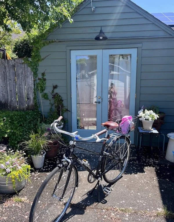My current studio is about a third of the size I used to have back at Building C, with absolutely no storage and just enough painting room for me and not much else. But it’s sweet being just a few steps away from our home. I found some leftover paint the other day and on a whim, decided to change from pink and use the same soothing dix blue I had used on our house doors. These french doors were “rescued” at Ballard Reuse back when we moved into our house in 2019, and replaced an old pull up carriage house door that lacked the ease and charm I now get to enjoy.